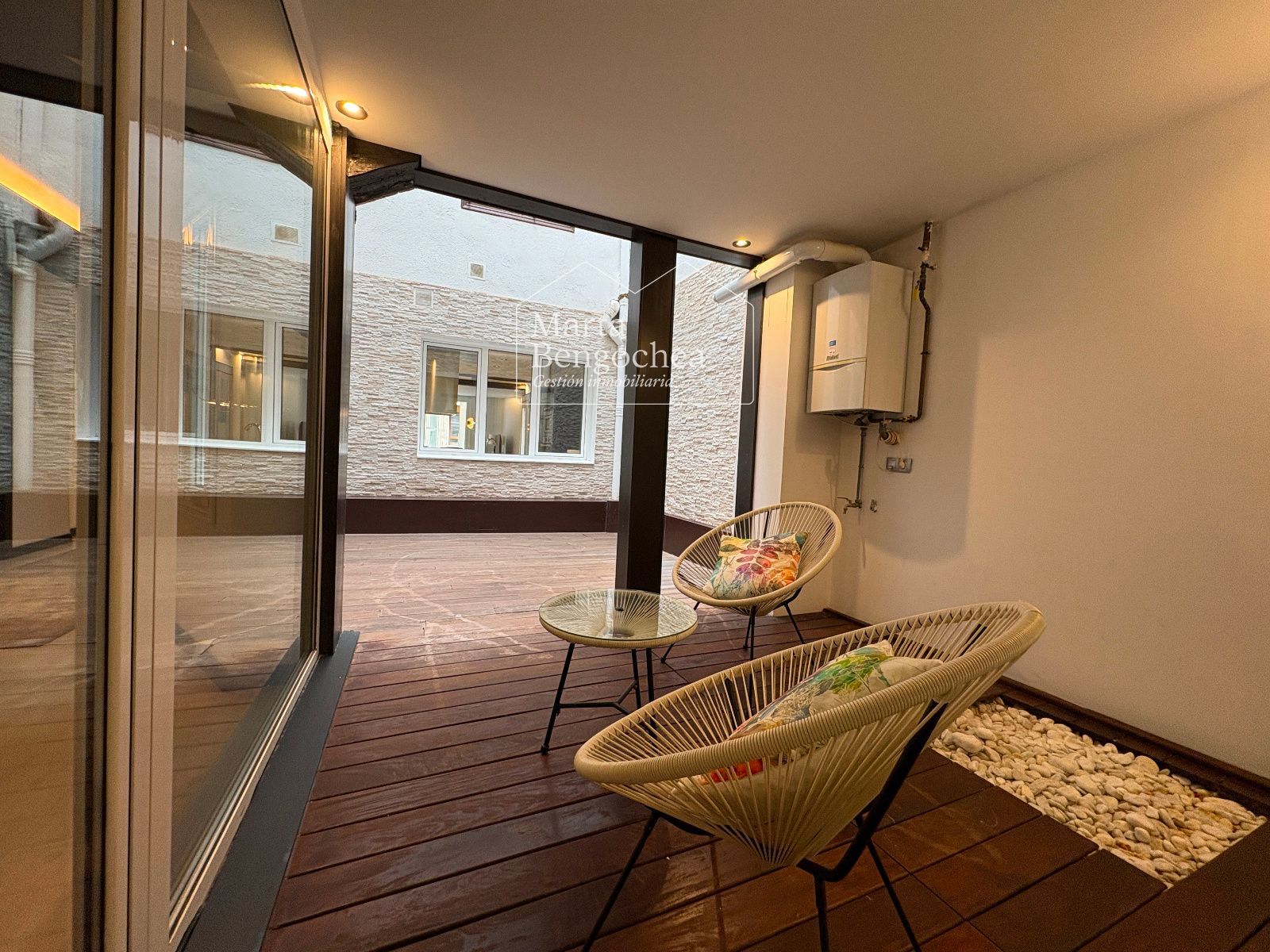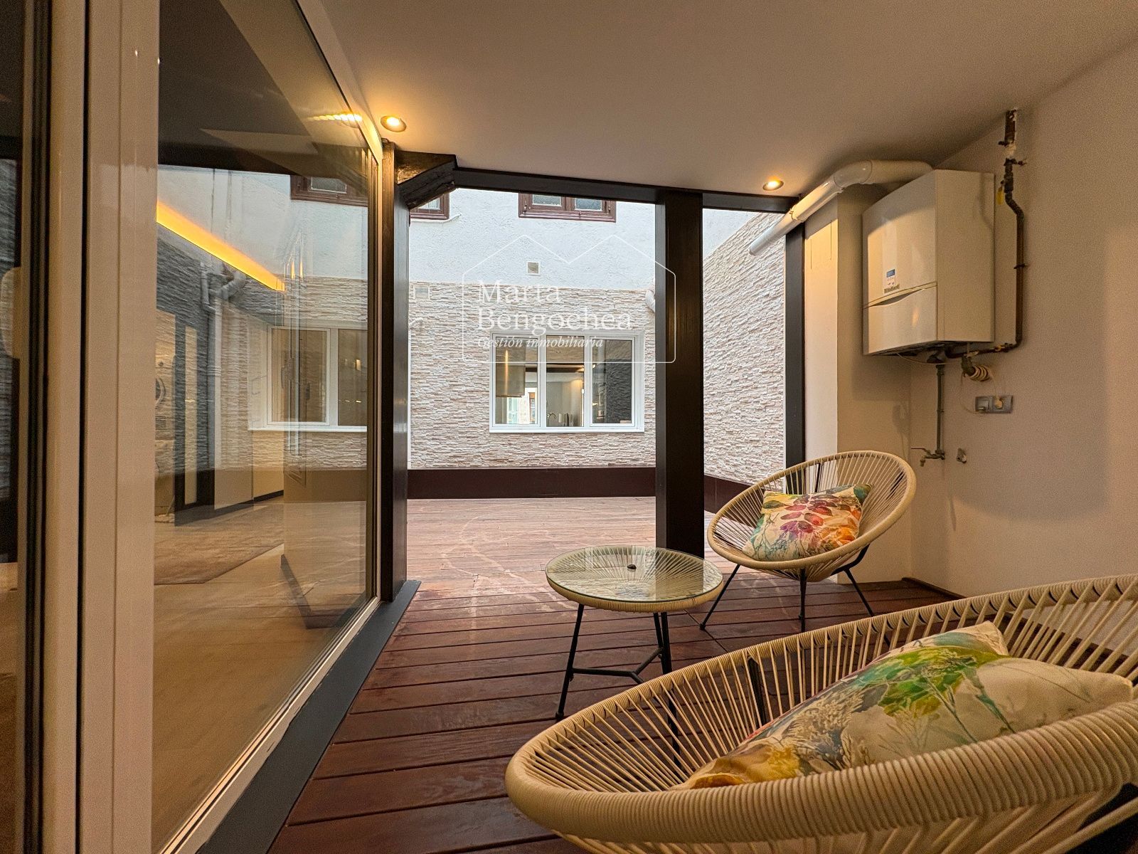 Uno de los elementos más singulares es su terraza privada de 20 m², ubicada en el patio de luces comunitario. Ha sido diseñada como un patio japonés, con suelo de teca y una zona de estar que aporta calma, luz natural y un ambiente íntimo dentro de la vivienda.