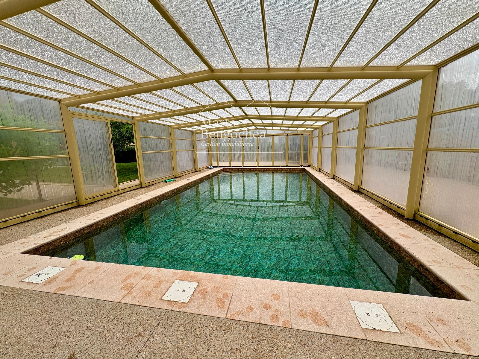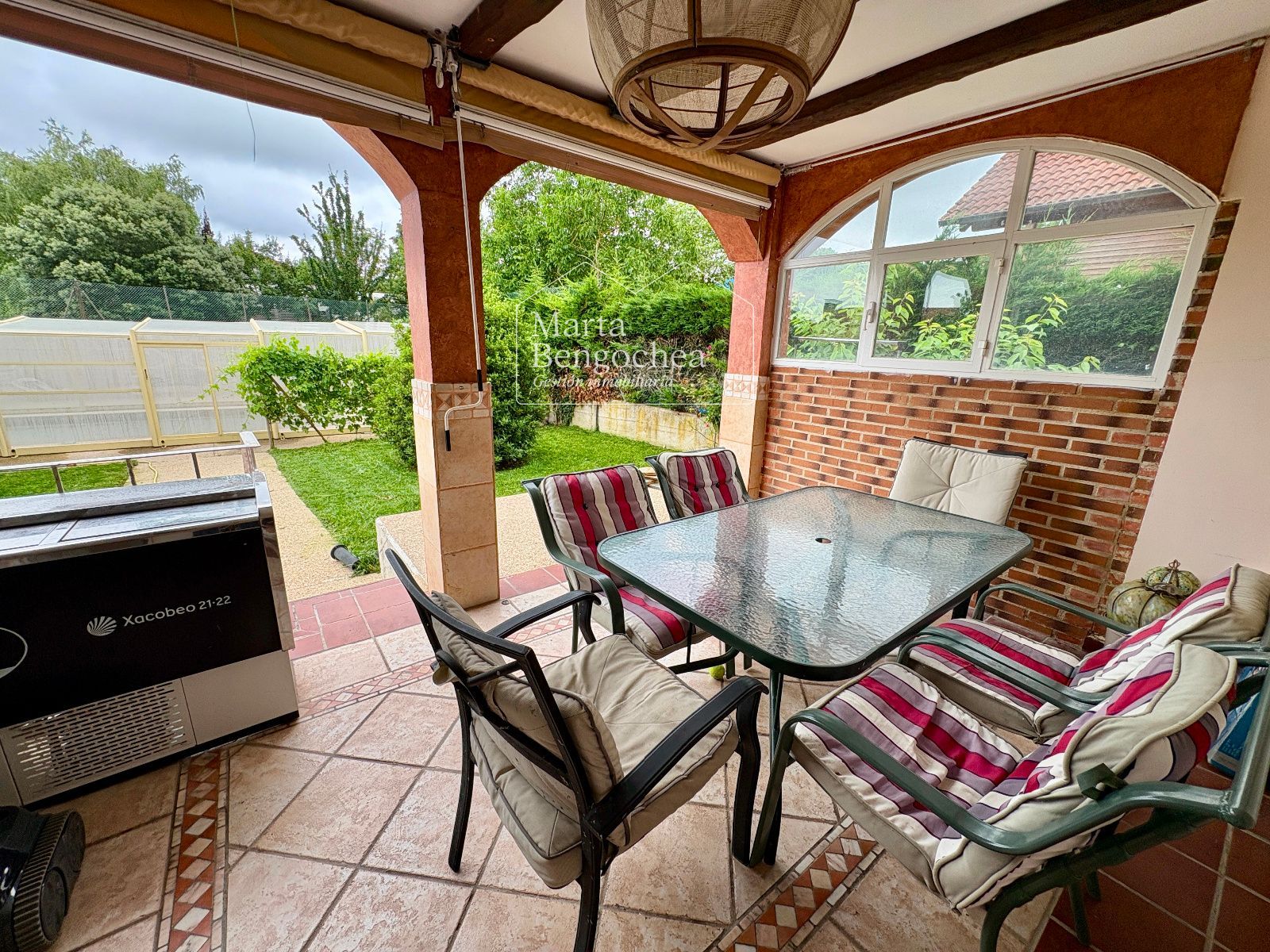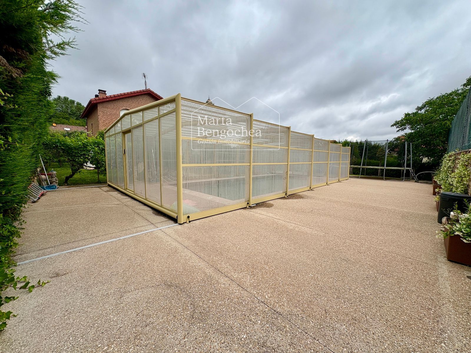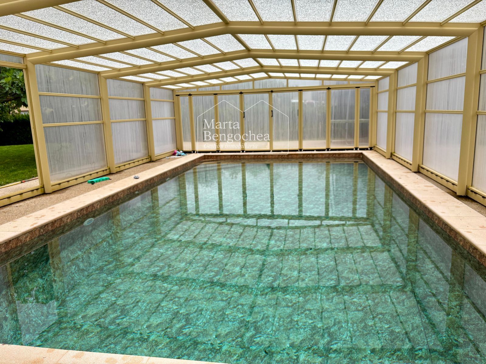 El jardín rodea la vivienda y alberga una piscina cubierta instalada hace dos años, con cubierta practicable que permite abrirla completamente en verano y disfrutarla también en los meses más fríos. La orientación este-suroeste garantiza luminosidad durante todo el día.