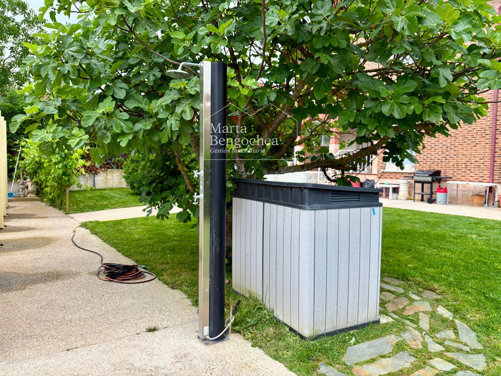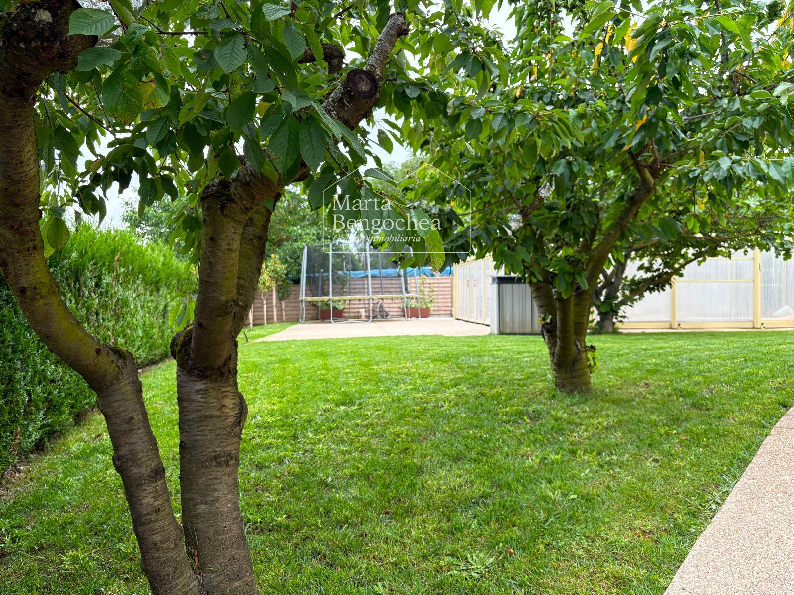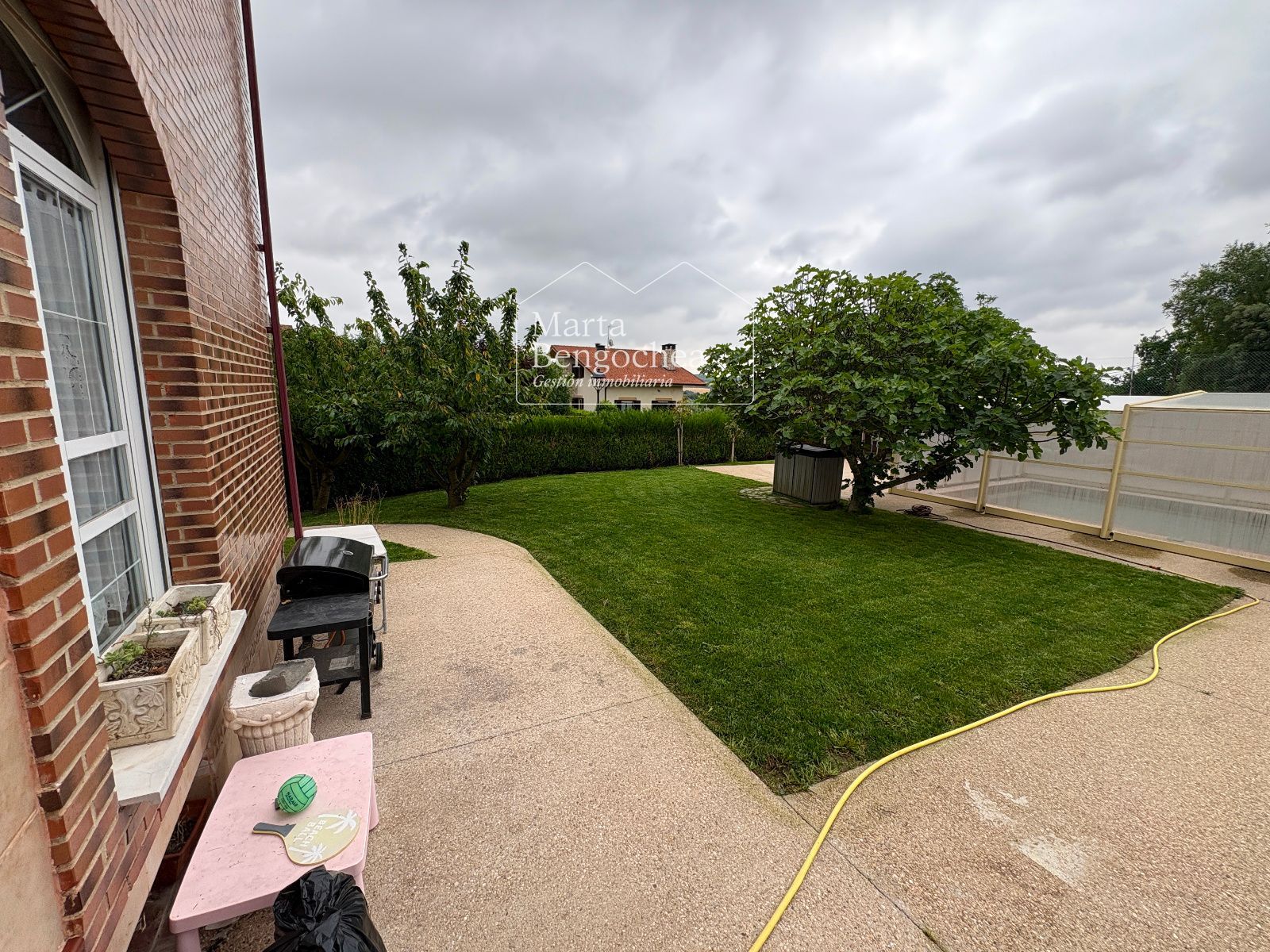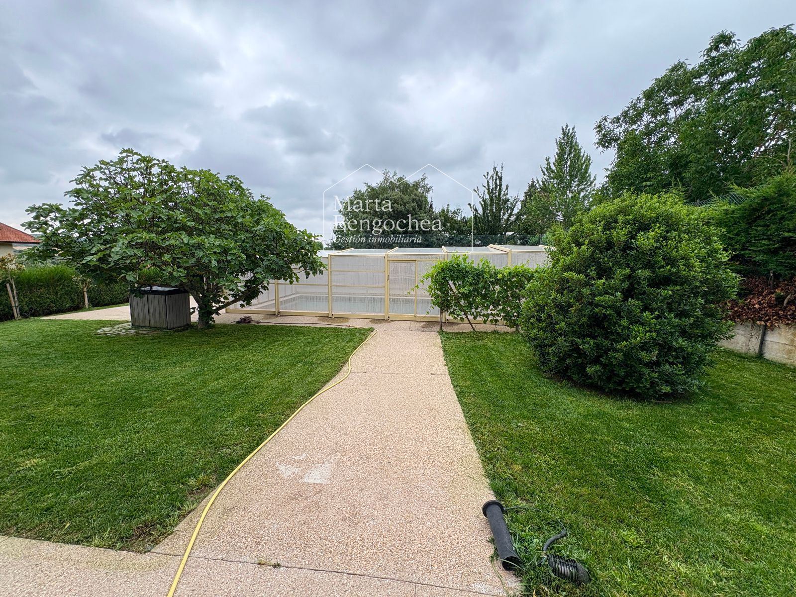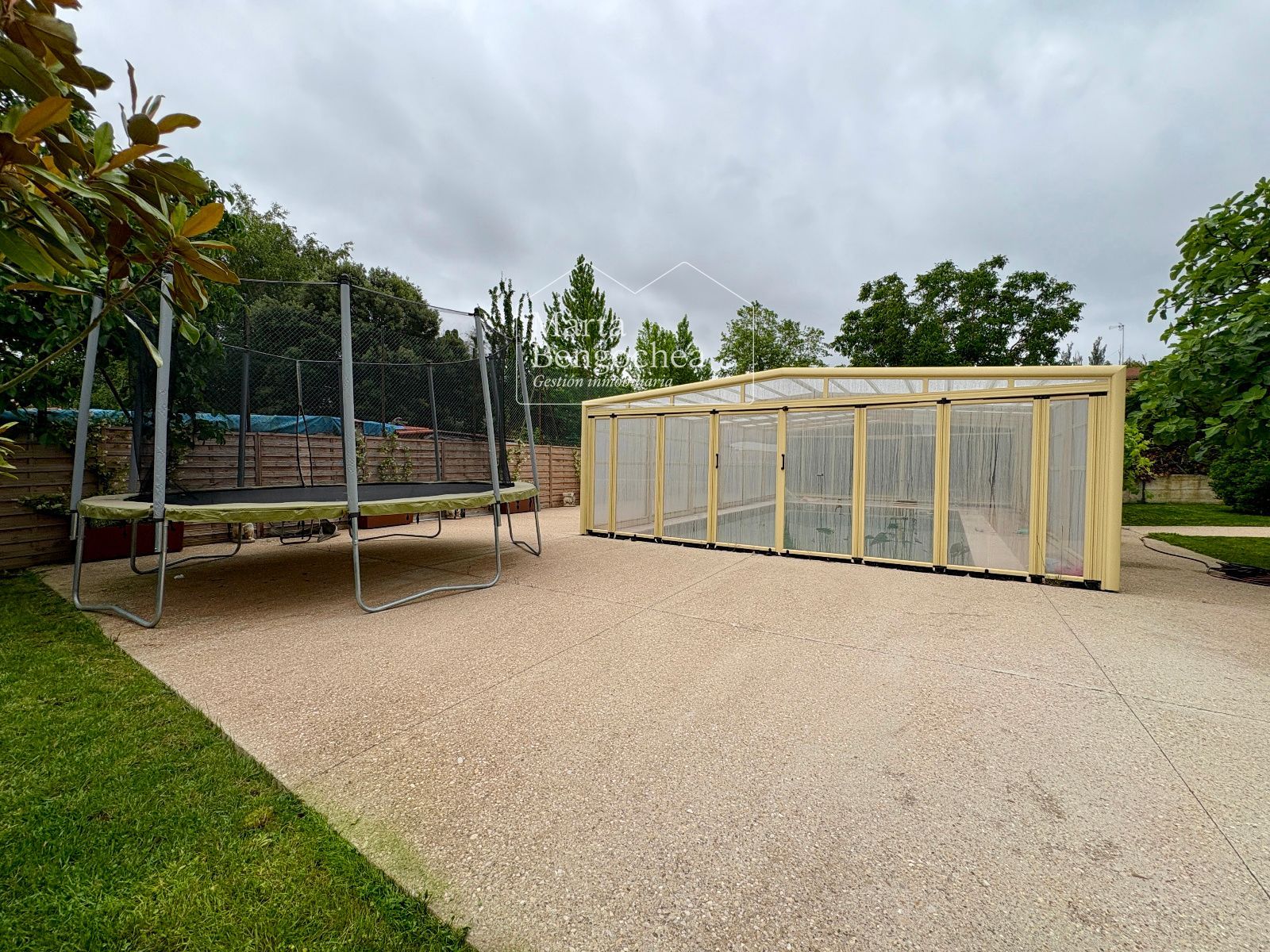 El jardín rodea la vivienda y alberga una piscina cubierta instalada hace dos años, con cubierta practicable que permite abrirla completamente en verano y disfrutarla también en los meses más fríos. La orientación este-suroeste garantiza luminosidad durante todo el día.